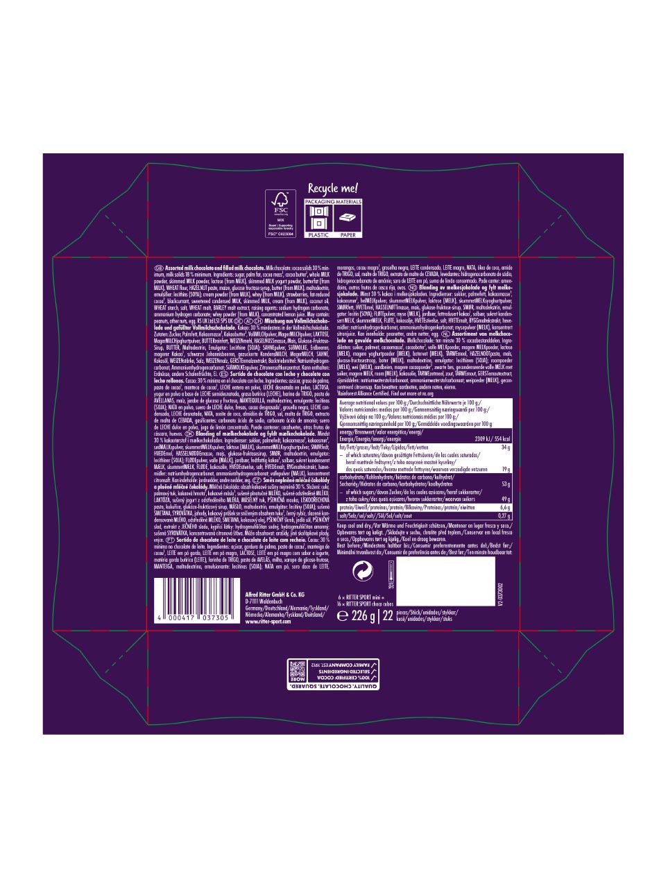Zutaten: Zucker, Palmfett, Kakaomasse¹, Kakaobutter¹, VollMILCHpulver, MagerMILCHpulver, LAKTOSE, MagerMILCHjoghurtpulver, BUTTERreinfett, WEIZENmehl, HASELNUSSmasse, Mais, Glukose-Fruktose-Sirup, BUTTER, Maltodextrin, Emulgator: Lecithine (SOJA); SAHNEpulver, SüßMOLKE, Erdbeeren, magerer Kakao¹, schwarze Johannisbeeren, gezuckerte KondensMILCH, MagerMILCH, SAHNE, Kokosöl, WEIZENstärke, Salz,WEIZENmalz, GERSTEnmalzextrakt, Backtriebmittel: Natriumhydrogencarbonat, Ammoniumhydrogencarbonat; SüßMOLKEnpulver, Zitronensaftkonzentrat.