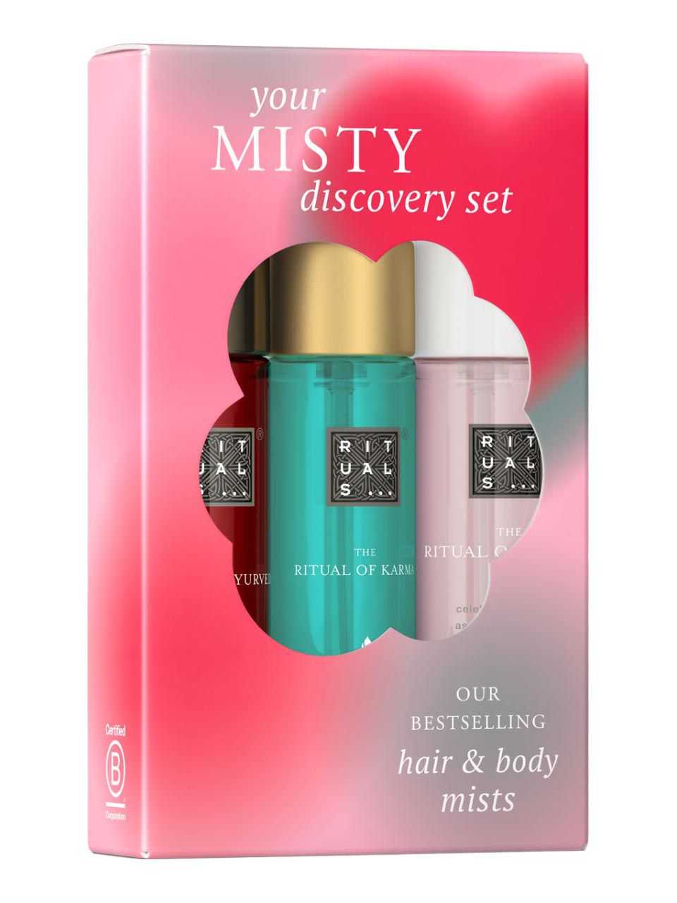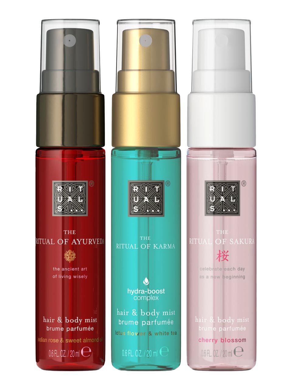 The Ritual of Karma Hair & Body Mist 20ml: Aqua/Water, PEG-40 Hydrogenated Castor Oil, Parfum/Fragrance, Betaine, Nelumbo Nucifera (Lotus) Flower Extract, Camellia Sinensis (White Tea) Leaf Extract, Triethyl Citrate, Squalane, Glycerin, Butylene Glycol, Aloe Barbadensis (Aloe Vera) Leaf Juice, Fucus Vesiculosus Extract, Enteromorpha Compressa Extract, Porphyra Umbilicalis Extract, Undaria Pinnatifida Extract, Lithothamnion Calcareum Extract, Propylene Glycol, Benzyl Salicylate, Limonene, Linalool, Hexyl Cinnamal, Citronellol, Alpha-Isomethyl Ionone, Citral, Isoeugenol, Cinnamal, Sodium Benzoate, Potassium Sorbate, Tetrasodium Iminodisuccinate, Sorbic Acid, Lactic Acid. The Ritual of Ayurveda Hair & Body Mist 20ml: Aqua/Water, PEG-40 Hydrogenated Castor Oil, Parfum/Fragrance, Rosa Damascena (Damask Rose) Flower Water, Prunus Amygdalus Dulcis (Sweet Almond) Seed Extract, Sodium Benzoate, Hexyl Cinnamal, Limonene, Linalyl Acetate, Potassium Sorbate, Linalool, Citrus Aurantium Peel Oil, Coumarin, Tetramethyl Acetyloctahydronaphthalenes, Acetyl Cedrene, Citronellol, Benzyl Benzoate, Geranyl Acetate, Pinene, Anethole, Citral, Citric Acid, Terpineol, Glycerin, Benzyl Alcohol, Rose Ketones, Beta-Caryophyllene, Cananga Odorata Oil/Extract, Dimethyl Phenethyl Acetate, Alpha-Isomethyl Ionone, Terpinolene, Cinnamyl Alcohol, Benzyl Cinnamate, Vanillin, Geraniol, Sorbic Acid. The Ritual of Sakura Hair & Body Mist 20ml: Aqua/Water, PEG-40 Hydrogenated castor Oil, Parfum/Fragrance, Prunus Serrulata (Japanese Cherry) Flower Extract, Sodium Benzoate, Hexyl Cinnamal, Potassium Sorbate, Benzyl Salicylate, Coumarin, Citronellol, Geraniol, Alpha-Isomethyl Ionone, Glycerin, Terpineol, Dimethyl Phenethyl Acetate, Tetramethyl Acetyloctahydronaphthalenes, Cinnamyl Alcohol, Citrus Aurantium Peel Oil, Limonene, Linalool, Carvone, Rose Ketones, Benzaldehyde, Isoeugenol, Citral, Benzyl Alcohol, Phenoxyethanol, Sodium Citrate, Sodium Metabisulfite, Citric Acid
