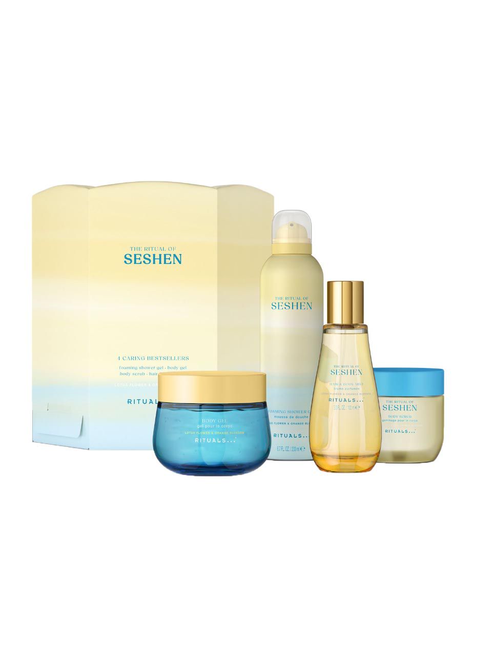 The Ritual of Seshen Body Gel GS: Aqua/Water, Aloe Barbadensis (Aloe Vera) Leaf Juice, PEG-40 Hydrogenated Castor Oil, Glycerin, Xanthan Gum, Parfum/Fragrance, Citrus Aurantium (Bitter Orange) Amara Flower Water, Nelumbo Nucifera (Lotus) Flower Extract, Phenoxyethanol, Betaine, Caprylyl Glycol, Potassium Sorbate, Panthenol, Sclerotium Gum, Hexyl Cinnamal, Tetramethyl Acetyloctahydronaphthalenes, Algin, Linalyl Acetate, Citric Acid, Alpha-Isomethyl Ionone, Biosaccharide Gum-1, Limonene, Pantolactone, Citrus Aurantium Peel Oil, Alpha-Terpinene, Linalool, Pinene, Terpinolene, Sodium Hydroxide, Gluconolactone, Sodium Benzoate, Sodium Chloride, Sodium Sulfate, Calcium Gluconate, CI 17200/Red 33, CI 42090/Blue 1 The Ritual of Seshen Body Scrub GS: Maris Sal/Sea Salt, Glycerin, PEG-7 Glyceryl Cocoate, Aqua/Water, Parfum/Fragrance, Cocamidopropyl Betaine, Citrus Aurantium Amara (Bitter Orange) Flower Water, Nelumbo Nucifera (Lotus) Flower Extract, Sucrose Palmitate, Sodium Chloride, Gluconolactone, Sodium Benzoate, Calcium Gluconate, Hexyl Cinnamal, Tetramethyl Acetyloctahydronaphthalenes, Linalyl Acetate, Alpha-Isomethyl Ionone, CI 15985/Yellow 6, CI 19140/Yellow 5 The Ritual of Seshen Foaming Shower Gel GS: Aqua/Water, Sodium Laureth Sulfate, Decyl Glucoside, Butane, Glycerin, Parfum/Fragrance, Isopropyl Palmitate, Citrus Aurantium Amara (Bitter Orange) Flower Extract, Nelumbo Nucifera (Lotus) Flower Extract, PEG-40 Hydrogenated Castor Oil, Hydroxyethylcellulose, Sorbitol, Propane, Sodium Benzoate, Citric Acid, Propylene Glycol, Potassium Sorbate, Sorbic Acid, Hexyl Cinnamal, Tetramethyl Acetyloctahydronaphthalenes, Linalyl Acetate, Alpha-Isomethyl Ionone The Ritual of Seshen Hair & Body Mist GS: Aqua/Water, PEG-40 Hydrogenated Castor Oil, Parfum/Fragrance, Betaine, Triethyl Citrate, Citrus Aurantium Amara (Bitter Orange) Flower Water, Nelumbo Nucifera (Lotus) Flower Extract, Propylene Glycol, Citric Acid, Butylene Glycol, Gluconolactone, Calcium Gluconate, Sodium Benzoate, Potassium Sorbate, Sorbic Acid, Hexyl Cinnamal, Alpha-Isomethyl Ionone, Limonene, Linalool, Tetramethyl Acetyloctahydronaphthalenes, Linalyl Acetate, Citrus Aurantium Dulcis (Orange) Peel Oil, Alpha-Terpinene, Pinene, Terpinolene, Pogostemon Cablin (Patchouli) Oil