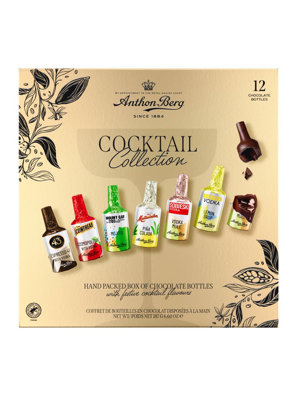 Sugar, cocoa mass*, cocoa butter*, water, spirits 4% (vodka, rum), Licor 43® concentrate 1%, fruit juice concentrates 0.6% (lime, cranberry, lemon, pineapple), natural orange flavour (Cointreau®) 0.5%, coffee extract, natural flavourings, flavourings, orange oil .