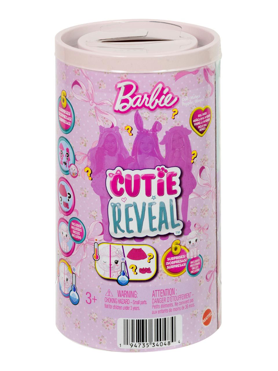Barbie Cutie Reveal Cuddly Series Chelsea dolls offer the cutest wow moments as kids open the package to find six surprises! One of three different characters can be found -- there's a Kitten, Bunny and Lamb, all celebrating spring with sweet pastel colors. Which doll will you reveal? Remove the plush costume to discover a Chelsea small doll. Continue finding more surprises like a skirt and mini pet friend that matches the doll's costume. Flip the plush top for an over-sized jacket and the costume head for a mini pet bed ! Use water for even more cuteness with repeat color-change transformation on the mini pet's face! Kids will love discovering all the surprises in the adorable Barbie Cutie Reveal Cuddly Series. Each doll sold separately, subject to availability. Dolls cannot stand alone. Colors and decorations may vary.
