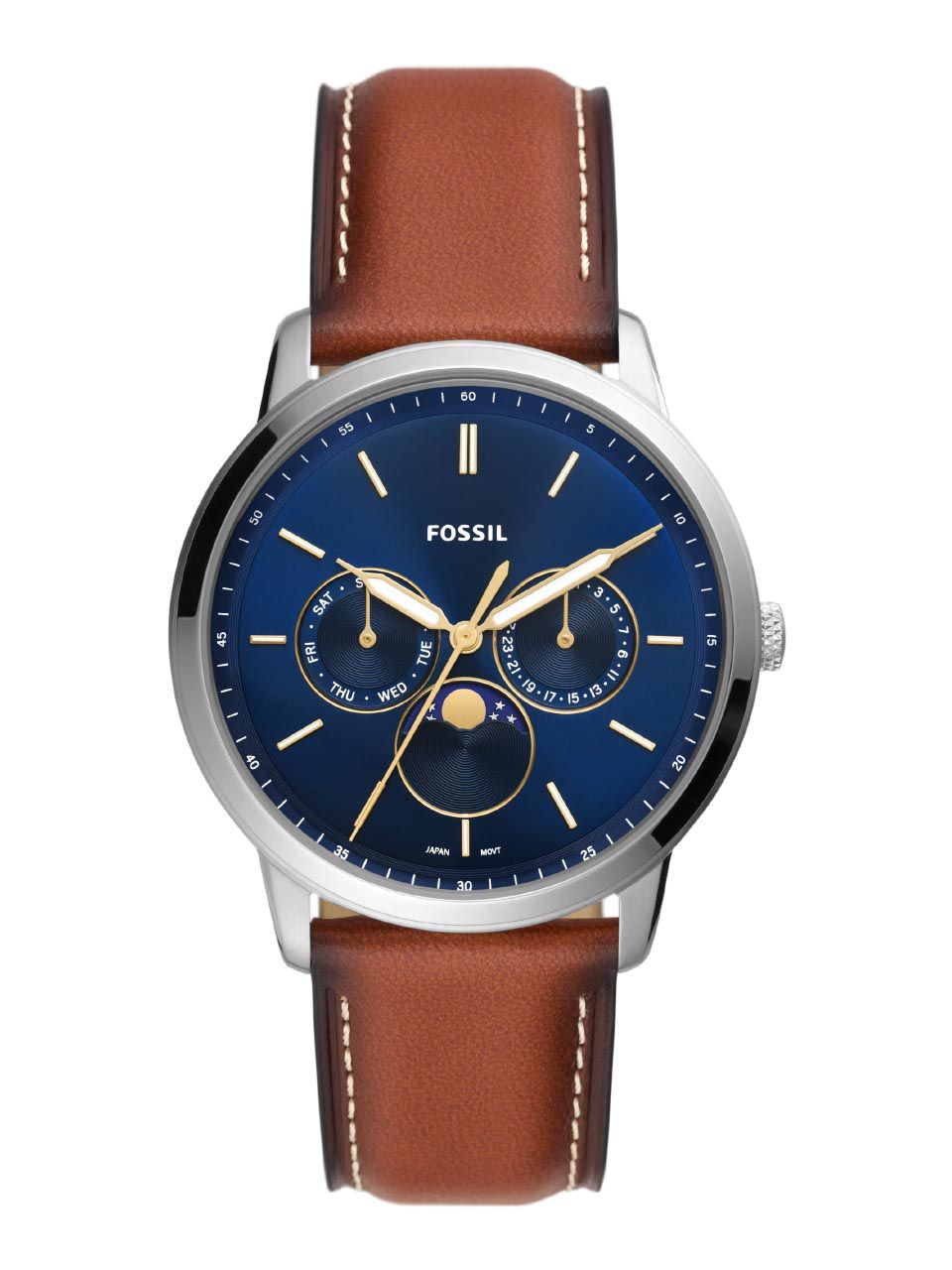 This 42mm Neutra Minimalist features a blue sunray dial, multifunction movement and brown leather strap.