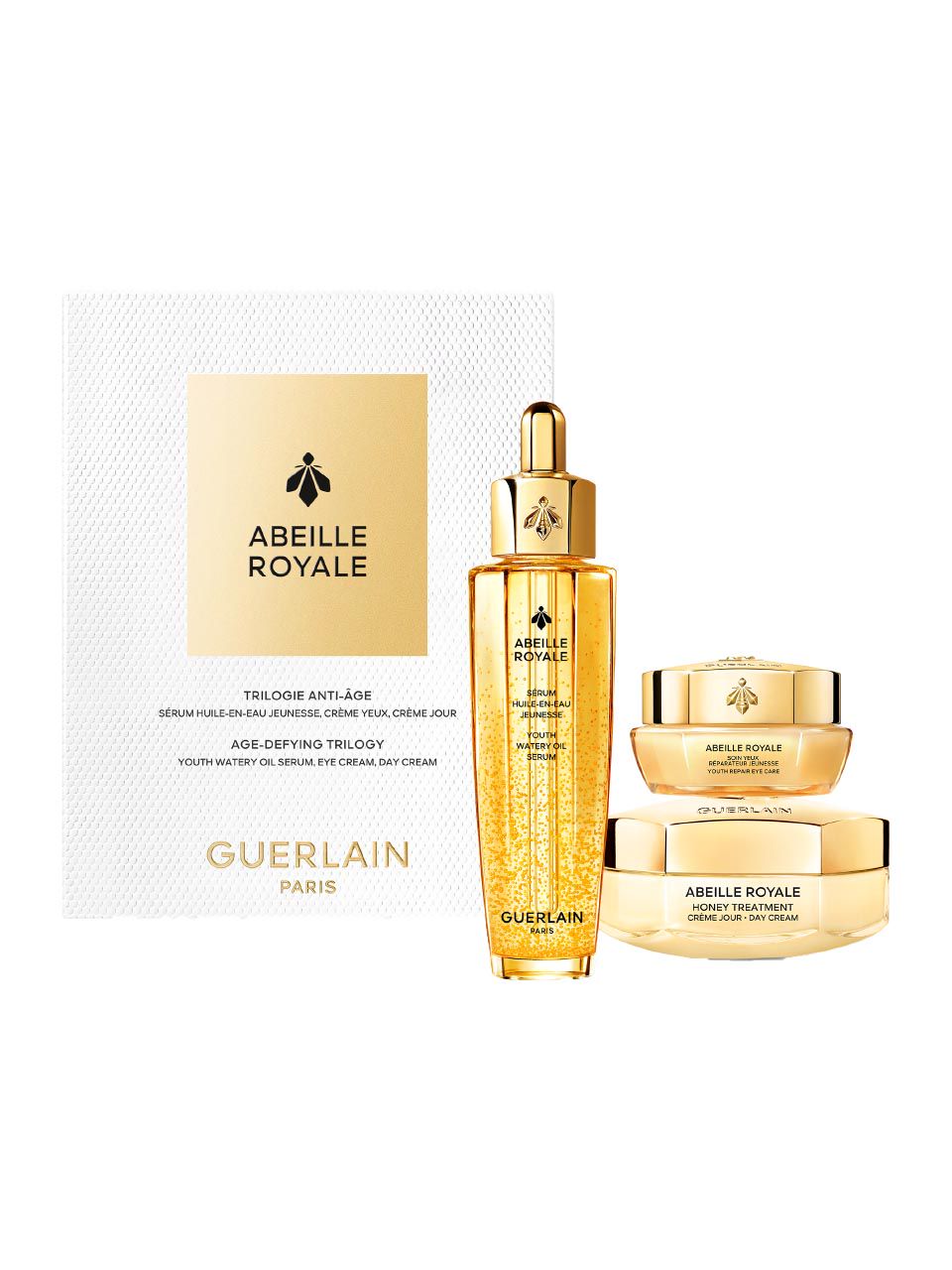 The eye area is the thinnest and most exposed part of the face, and it also repairs itself less effectively. For the Youth Repair Eye Care, Guerlains research team has therefore concentrated its three black bee honeys fivefold¹ to deeply² repair aging micro damage. Instantly wide open, the eyes seem radiant as lifted. All types of wrinkles³ appear durably corrected. Result of 15 years of research and relying on 9 patents and 9 publications, the new-generation Youth Watery Oil Serum draws its repairing power from three honeys produced by the black bee. Deeply repaired², skin regains plumpness and radiance while wrinkles are visibly filled. Inspired by clinical honey bandages, Honey Treatment Day Cream concentrates the most powerful bee products chosen by Guerlain research to correct 4 visible marks of collagen loss linked to ageing. Day after day, wrinkles are reduced and skins firmness, smooth appearance and radiance are restored. ¹Compared to Youth Watery Oil Serum. ²In the epidermis. ³Under-eye wrinkles, crows feet wrinkles, frown lines, wrinkles on the upper eyelid.