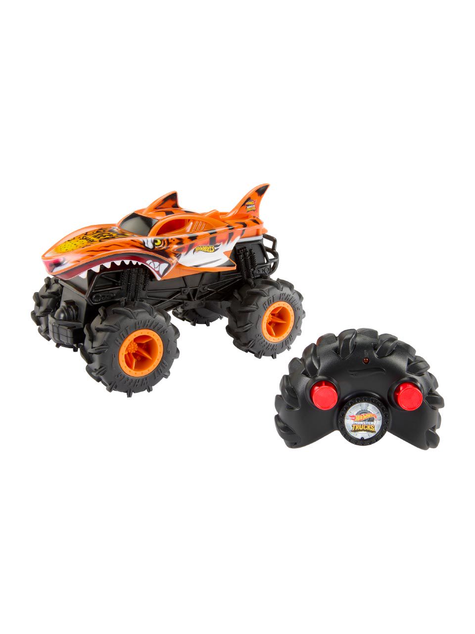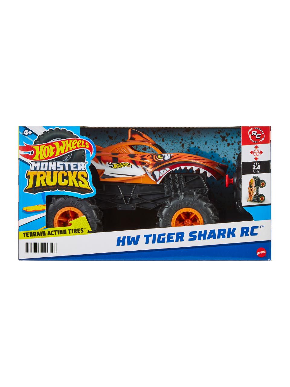 Take the wheel for awesome Monster Trucks action with this remote-control Tiger Shark! This untamed predator of the Monster Trucks universe can plow through various obstacles with its Terrain Action Tires™ and all-wheel-drive capabilities. Launch into a "Shark Tooth Chomp" as it smashes and crashes into anything in its path. Monster Truck fans will want it and the Hot Wheels® RC Monster Trucks Race Ace™ and HW 5-Alarm™ to wage epic battle sequences just like those in Monster Trucks Live. Each sold separately, subject to availability. Colors and decorations may vary.