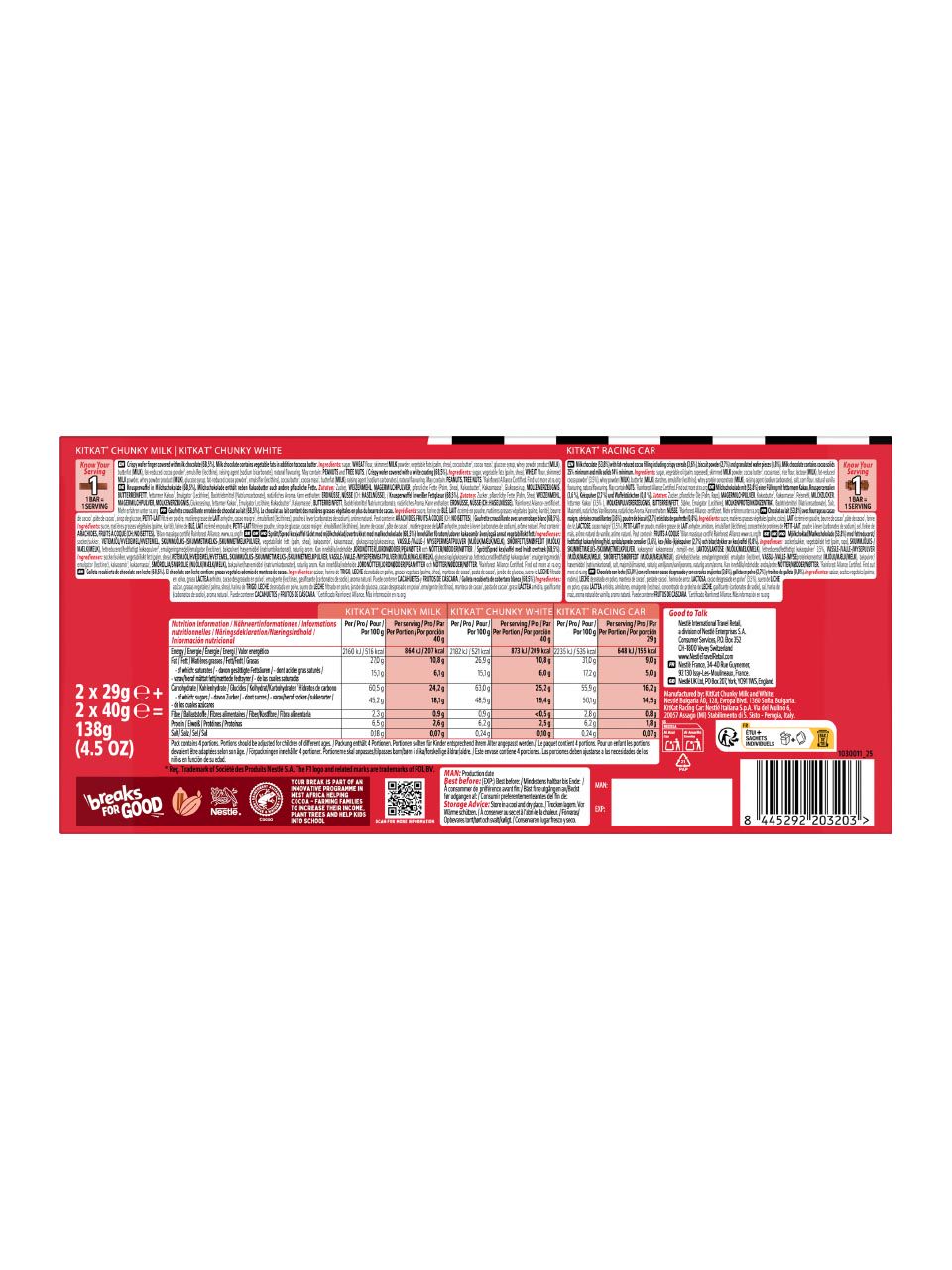 Sugar, WHEAT flour, skimmed MILK powder, vegetable fats (palm, shea), cocoa butter, cocoa mass, glucose syrup,whey powder product (MILK), butterfat (MILK), fat-reduced cocoa powder, emulsifier (lecithins), raising agent (sodium bicarbonate),natural flavouring. May contain: PEANUTS and TREE NUTS.