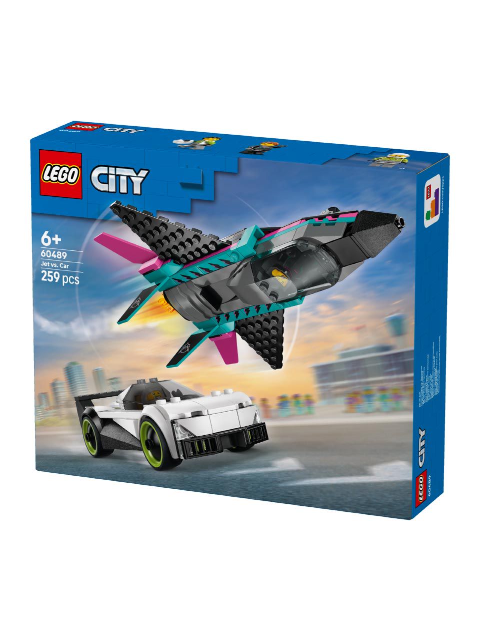 This double-feature LEGO® City Jet vs. Car (60489) vehicle toy playset includes a sleek supercar and a supersonic jet for imaginative racing fun. The toy jet features swept-back wings, twin vertical fins and stabilisers. Kids can slide a lever to engage the jet’s afterburners and open the cockpit of the supercar to access the detailed interior, complete with a racing seat. Just add the pilot and racing driver minifigures for hours of epic racing action.