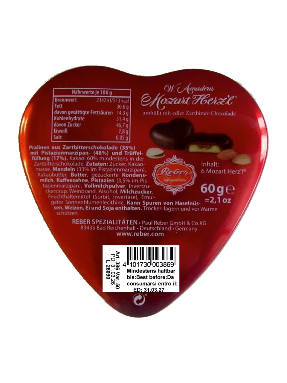 Sugar, cocoa mass, almonds (33% in pistachio marzipan), cocoa butter, butter, sweetened condensed milk, coffee cream, pistachios (3.5% in pistachio marzipan), whole milk powder, invert sugar syrup, brandy, alcohol, lactose, humectant (sorbitol, invertase), Emulsifier Sunflower lecithin.