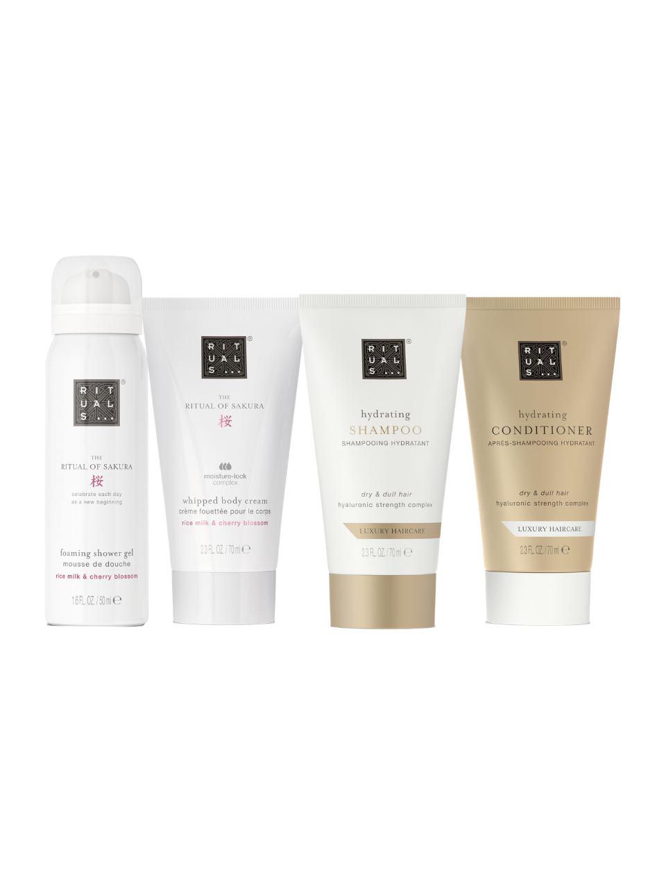 The Ritual of Sakura Foaming Shower Gel 50ml: Aqua/Water, Sodium Coco-Sulfate, Decyl Glucoside, Isopentane, Coco-Glucoside, Glycerin , Parfum/Fragrance, PEG-120 Methyl Glucose Dioleate, Isobutane, Isopropyl Palmitate, Oryza Sativa (Rice) Extract, Prunus Serrulata (Cherry) Flower Extract, Citric Acid, Sodium Benzoate, Hexyl Cinnamal, Guar Hydroxypropyltrimonium Chloride, Benzyl Salycilate, Linalool, Coumarin, Citronellol, Geraniol, Alpha-Isomethyl Ionone, Cinnamyl Alcohol, Tocopherol, Potassium Sorbate, Sodium Citrate, Sorbic Acid. The Ritual of Sakura Body Cream 70ml: Aqua/Water, Glycerin, Cetearyl Alcohol, Myristyl Myristate, Glyceryl Stearate SE , Ethylhexyl Stearate, Helianthus Annuus (Sunflower) Seed Oil, Distarch Phosphate, Isopropyl Myristate, Dicaprylyl Ether, Parfum/Fragrance, Glyceryl Stearate Citrate, Oryza Sativa (Rice) Extract, Prunus Serrulata Flower Extract, Phenoxyethanol, Hydroxypropyl Starch Phosphate, Sodium Cetearyl Sulfate, Caprylyl Glycol, Potassium Sorbate, Tocopheryl Acetate, Hexyl Cinnamal, Betaine, Benzyl Salicylate, Linalool, Tocopherol, Coumarin, Citronellol, Lactic Acid, Geraniol, Alpha-Isomethyl Ionone, Terpineol, Dimethyl Phenethyl Acetate, Tetramethyl Acetyloctahydronaphthalenes, Cinnamyl Alcohol, Adansonia Digitata Seed Oil , Butyrospermum Parkii (Shea) Butter, Pseudozyma Epicola/Safflower Seed Oil Ferment Extract Filtrate, Ubiquinone, Citrus Aurantium Peel Oil, Limonene, Carvone, Rose Ketones, Butylene Glycol, Benzaldehyde, Isoeugenol, Centella Asiatica Leaf Extract, Sodium Hydroxide, Sodium Citrate, Citric Acid, Sorbic Acid, Sodium Metabisulfite Hydrating Shampoo 70ml: Aqua/Water, Sodium Laureth Sulfate, Cocamidopropyl Betaine, Coco-Glucoside, PEG-40 Hydrogenated Castor Oil, Decyl Glucoside, Parfum/Fragrance, Sodium Chloride, Saccharide Isomerate, Sodium Hyaluronate, Hydrolyzed Sodium Hyaluronate, Hydroxypropyltrimonium Hyaluronate, Argania Spinosa Kernel Oil, Glyceryl Oleate, Glycol Distearate, Betaine, Citric Acid, Glyceryl Laurate, Hydrolyzed Wheat Protein, Hydroxypropyltrimonium Inulin, Sodium Benzoate, Guar Hydroxypropyltrimonium Chloride, Panthenol, Glycerin, Sclerocarya Birrea Seed Oil, Triethyl Citrate, Sodium Cocoyl Hydrolyzed Wheat Protein, Dipropylene Glycol, Phenoxyethanol, Propylene Glycol, 1,2-Hexanediol, Ethylhexylglycerin, Sodium Citrate, Citronellol , Citrus Aurantium Peel Oil, Geraniol, Hexyl Cinnamal, Limonene, Linalool, Linalyl Acetate, Tetramethyl Acetyloctahydronaphthalenes. Hydrating Conditioner 70ml: Aqua/Water, Cetearyl Alcohol, Glycerin, Behentrimonium Chloride, Cetrimonium Chloride, Parfum/Fragrance, Saccharide Isomerate, Sodium Hyaluronate, Sclerocarya Birrea Seed Oil, Betaine, Guar Hydroxypropyltrimonium Chloride, Panthenol, Sodium Benzoate, Isopropyl Alcohol, Lactic Acid, Quaternium-87, Argania Spinosa Kernel Oil, Propylene Glycol, Triethyl Citrate, Dipropylene Glycol, Citric Acid, Sodium Citrate, Citronellol, Citrus Aurantium Peel Oil, Geraniol, Hexyl Cinnamal, Limonene, Linalool, Linalyl Acetate, Tetramethyl Acetyloctahydronaphthalenes.