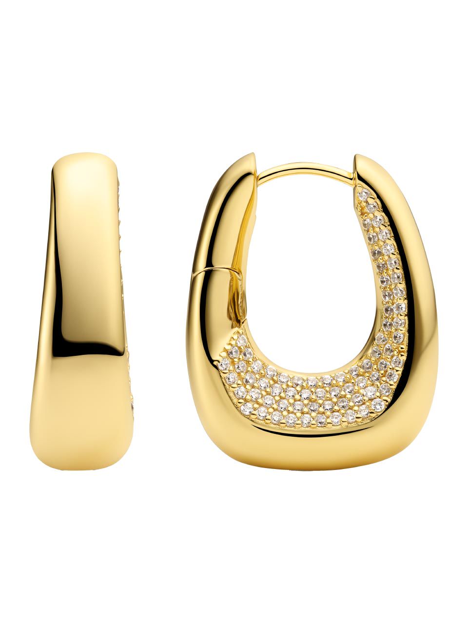 Earrings made of 18 karat gold plated 925 Sterling Silver, a polished surface, and handset with facet cut white zirconia.