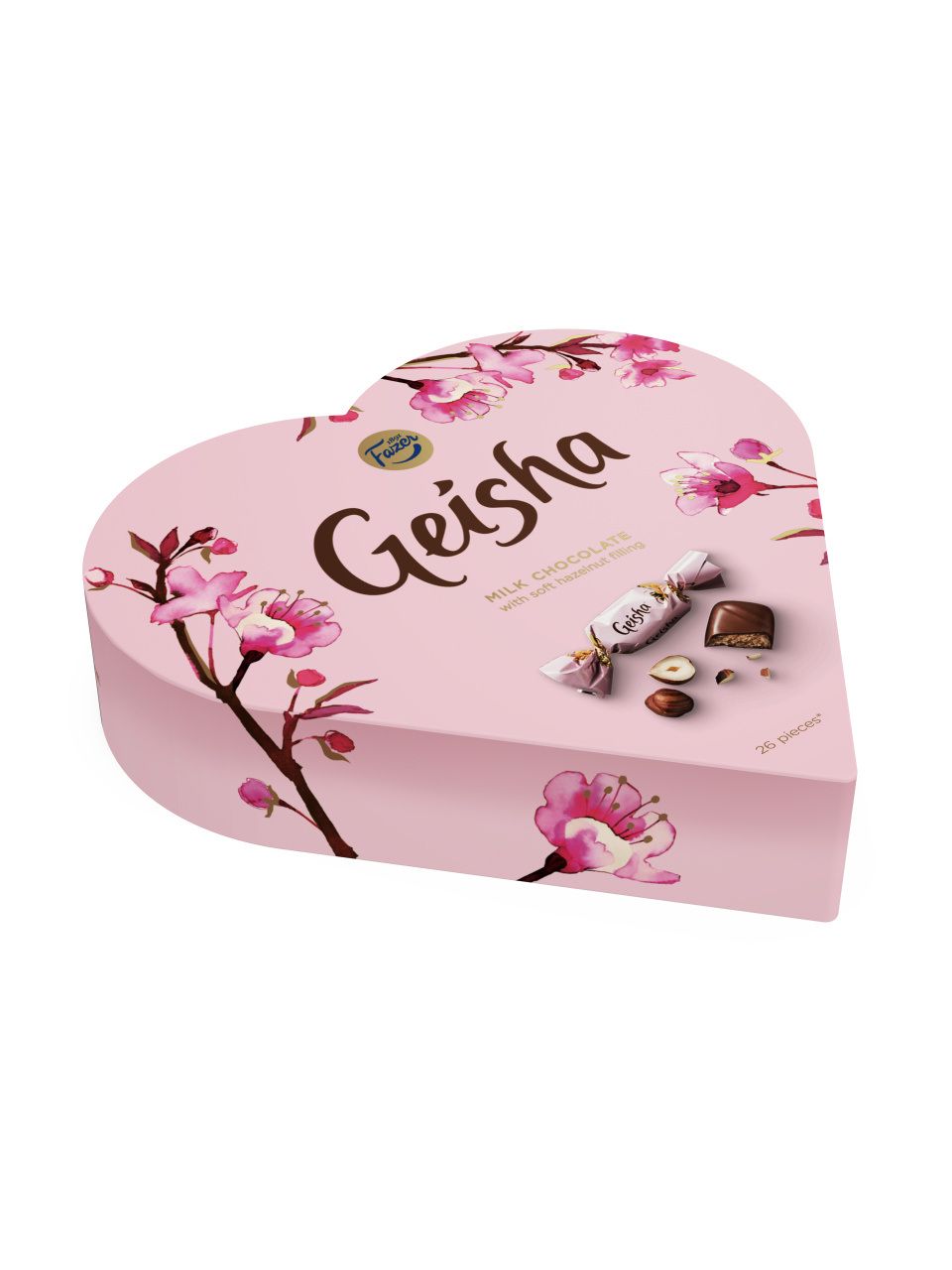 Geisha milk chocolate praline is wrapped around a hazelnut nougat filling. The luxuriously thick milk chocolate coating complementsthe soft yet crispy filling of the pralines in this heart-shaped box. The popular heart-shaped box makes a wonderful gift that doesnot need to be wrapped.Geisha milk chocolate praline is wrapped around a hazelnut nougat filling. The luxuriously thick milk chocolate coating complementsthe soft yet crispy filling of the pralines in this heart-shaped box. The popular heart-shaped box makes a wonderful gift that doesnot need to be wrapped.