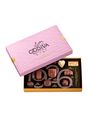 sugar, cocoa mass, cocoa butter, full cream milk powder, hazelnuts 5.7%, almonds 4.3%, cream (milk), vegetable oils (palm, palm kernel, sunflower), glucose syrup, humectant (E420 (ii), E420, E422), butter oil (milk), rice flour, pistachios 0.8%, butter (milk), skimmed milk powder, raspberry juice concentrate 0.5%, pear juice concentrate, maltodextrin, glucose, emulsifier (soy lecithin), flavourings, wheat flour, milk, apple juice 0.2%, invert sugar, invert sugar syrup, apple juice concentrate 0.1%, salt, cocoa nibs, wheat starch, natural vanilla, caramel sugar, fat reduced cocoa powder, acidity regulator (E330), lactose (milk).