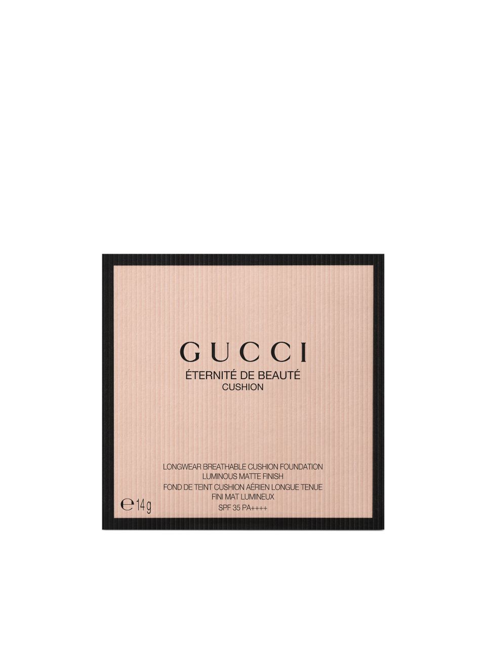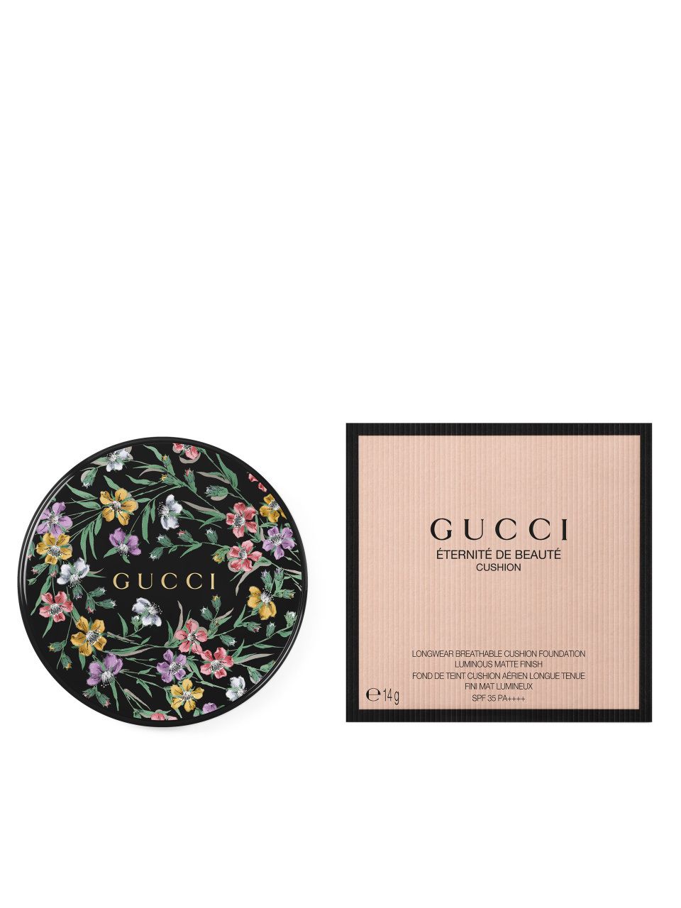 The 87% skincare-based formula is infused with bamboo powder for instant mattification, multi-weight hyaluronic acidhigh molecular weight for instant hydration and low-to-medium molecular weight for long-lasting deep hydration with a plumping effectand black rose oil for its soothing properties. Gucci Éternité de Beauté Cushion Foundation is presented inbeautiful black packaging featuring a colorful floral pattern. Inside, an integrated mirror makes it an on-the-go beauty ally. The clever pointed shape of its bouncy cushion applicator is designed for precise all-over application, especially under the eyes. The soft and smooth sponge is modeled to optimize the foundations absorption and adhesion to the skin, delivering a traceless finish that effortlessly blends in.One swipe does it all with Gucci Éternité de Beauté Cushion Foundation with SPF 35 PA++++, delivering a luminous matte finish with long-lasting full coverage and shine control in just one swipe. Theres no need to compromise between performance and skincare with Gucci Éternité de Beauté Cushion Foundation. One swipe does it all: high beautification for a full coverage, poreless complexion with a color-true finish, long-lasting performance delivering heat-, sweat-, water-, humidity-, and transfer-proof coverage with SPF 35PA++++, skin-rebalancing properties for oil control and boosted hydration, and second-skin comfort for a breathable texture.