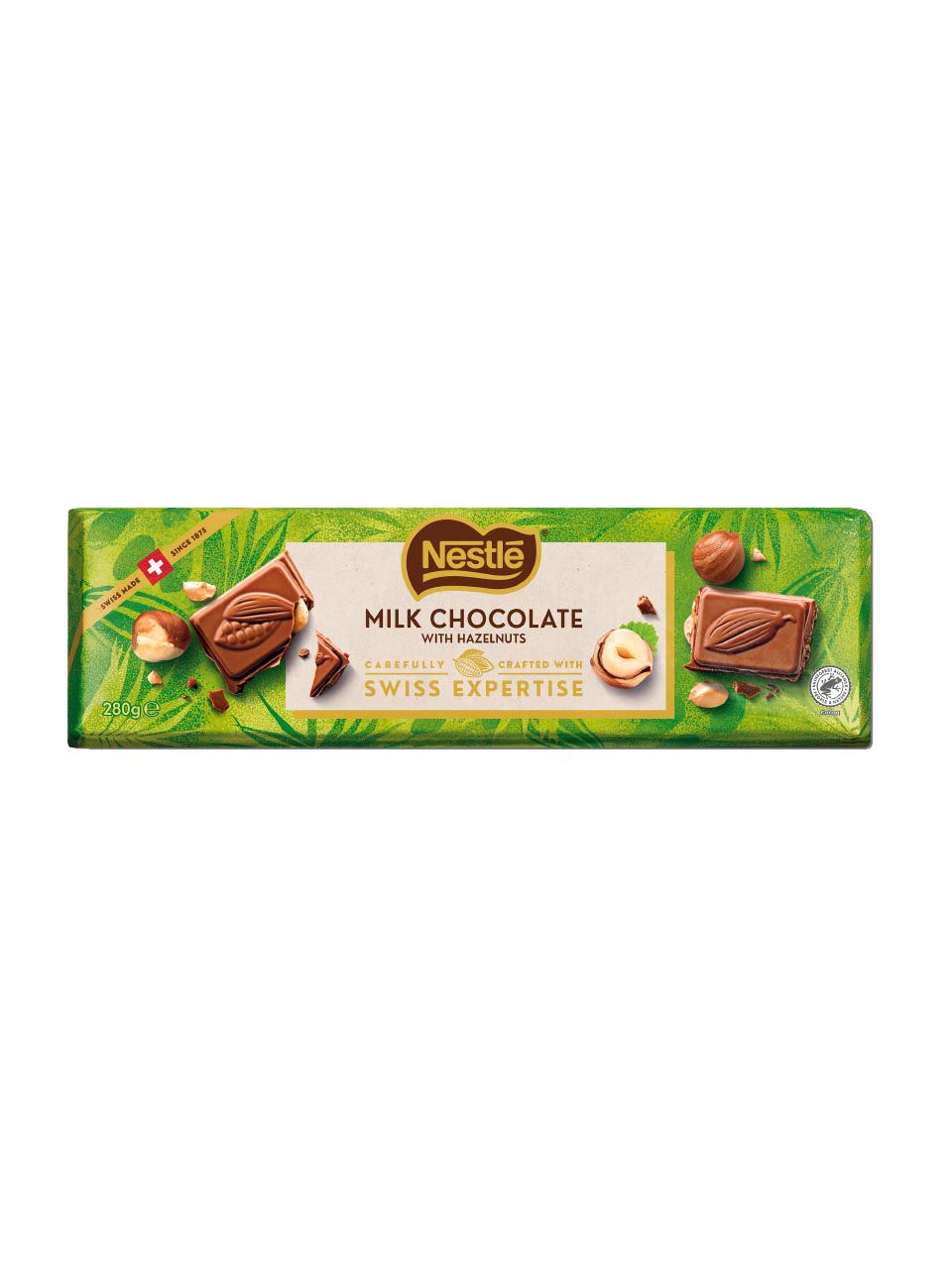 avor Swiss excellence with smooth milk chocolate enriched with whole roasted hazelnuts for a creamy texture and satisfying crunch. Crafted exclusively for travel retail, this premium tablet embodies authentic Swiss craftsmanship and refined quality. Presented in an elegant pack, its perfect for gifting or indulging yourself. Made with Rainforest Alliance certified cocoa, supporting sustainability and better livelihoods for farming communities.